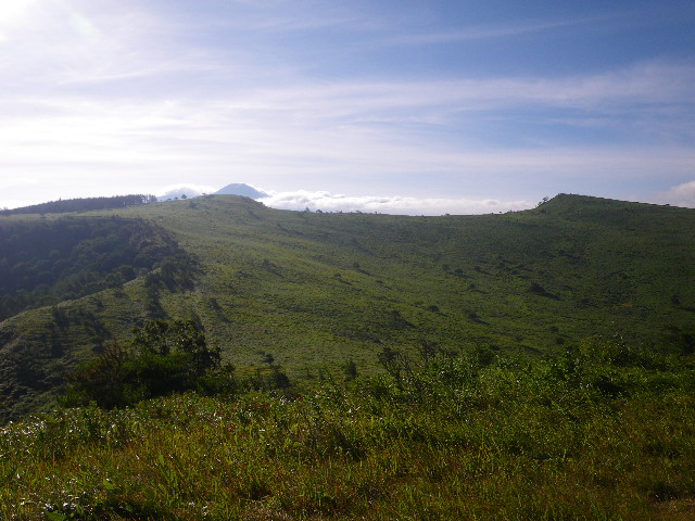 山彦ノ北ノ耳(左)と南ノ耳。バックは富士山、ではなくて蓼科山 (36.0725 138.1051)