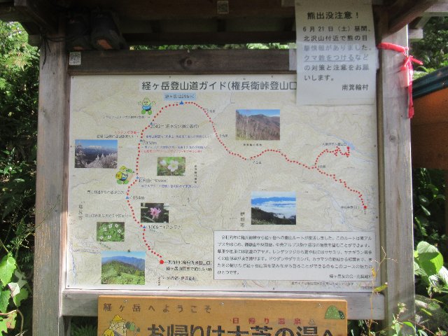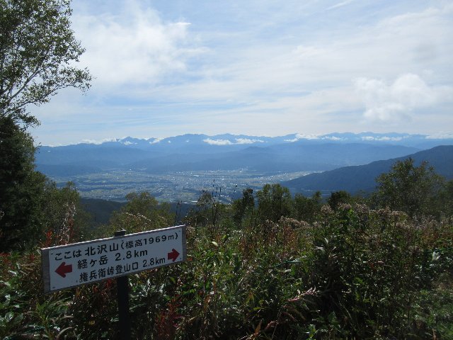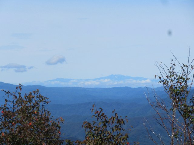山下さん(JG1MIT)鈴木さん(7L1UGC)と経ヶ岳に上がったときは東の仲仙寺側からであった。 権兵衛トンネルが開通した今は地元中学も登る権兵衛峠からがメインだそうで、仲仙寺コースは藪っぽくなったそうである。 図子さんと権兵衛峠を8時に出発し、距離的には中間にあたる北沢山に9時40分に到着。 写真のように南アルプスや御岳・乗鞍岳さらには加賀白山が見える。