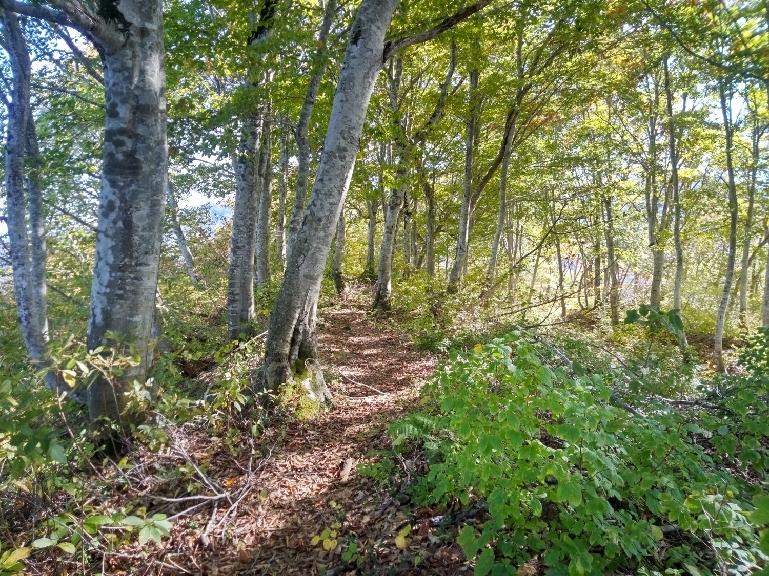 乾いた落ち葉を踏みながら歩くブナ林