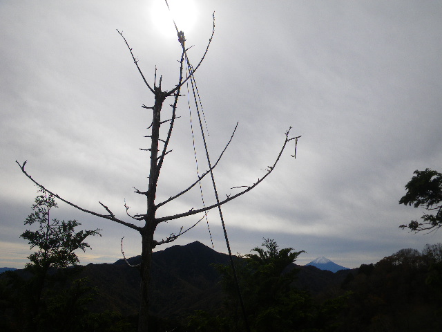 枯れ木に立て掛けたポケットDP。バックは、大菩薩嶺と冠雪の富士山