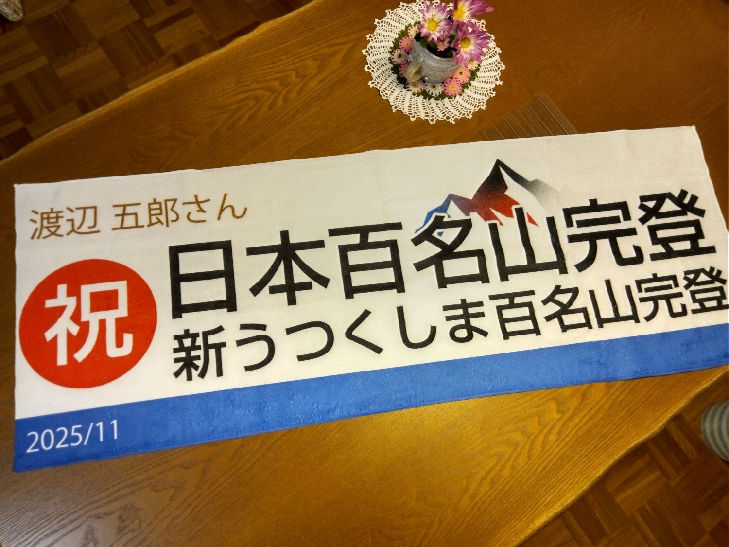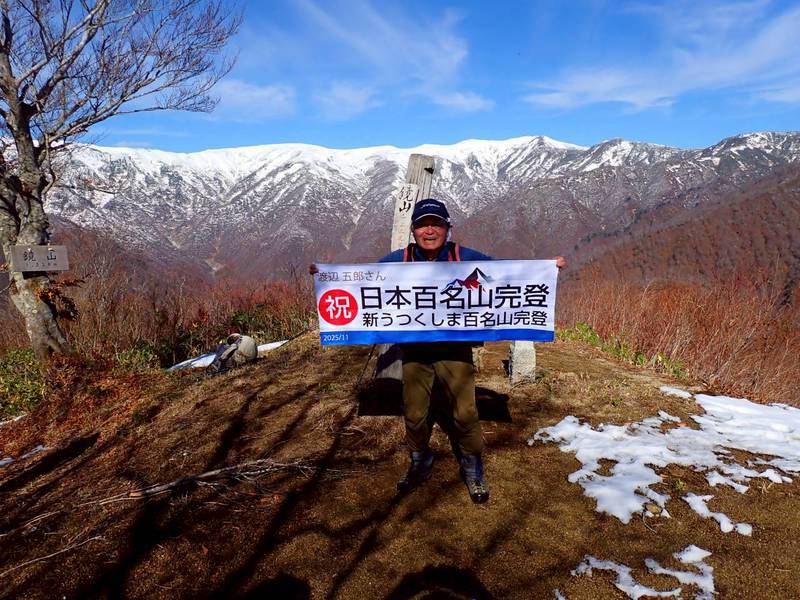 仲間が用意してくれた「祝 日本百名山完登、新うつくしま百名山完登」の横断幕、「日本百」や「福島百」等、数を追うのは山家として疑問を持っていいたが、結果として自分の好みの山ばかりではは無く幅広く各地の山を歩けての周辺の地理、歴史を学ぶことが出来ました。