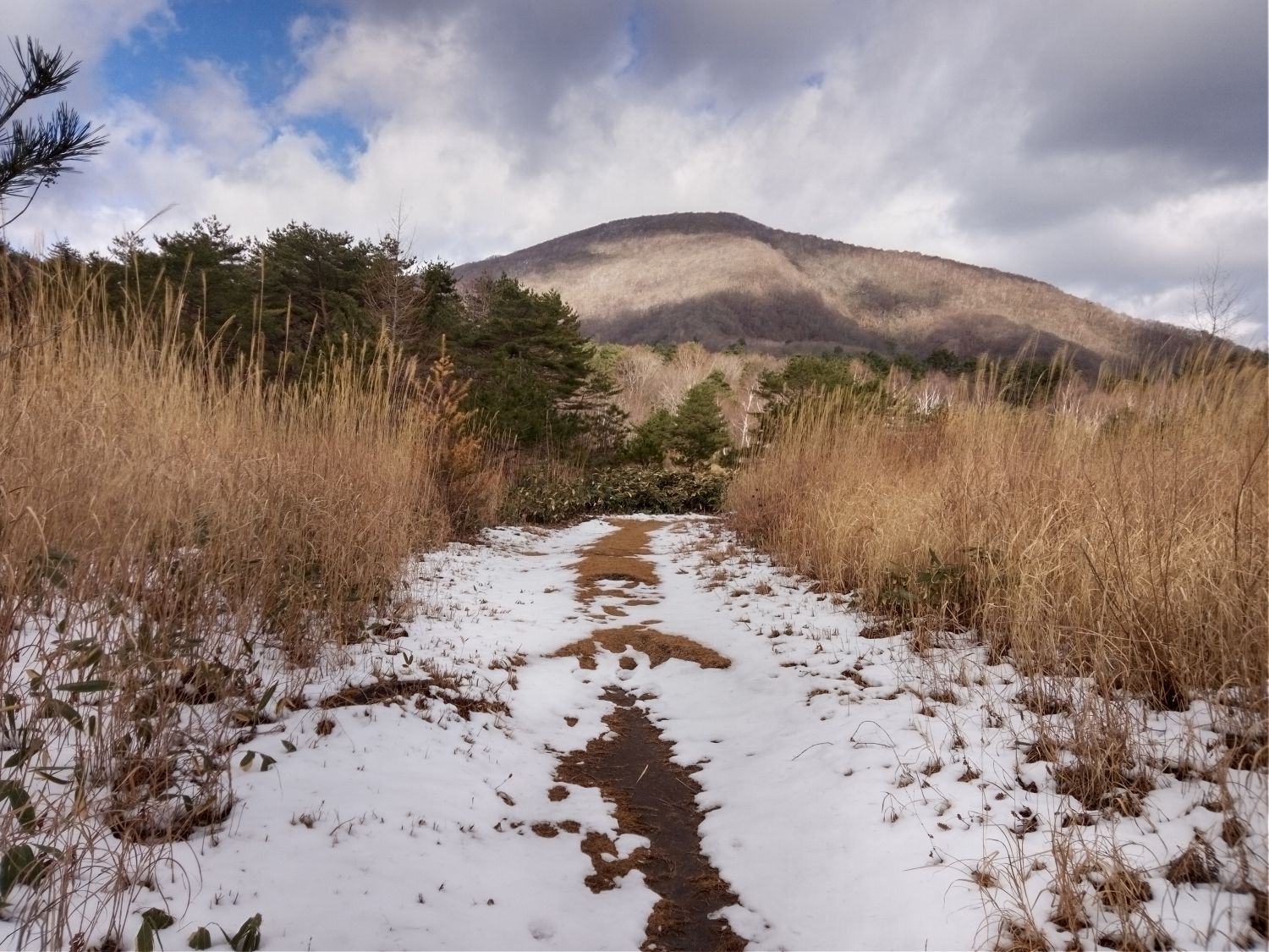 登山道に雪、兎平から山頂を見る