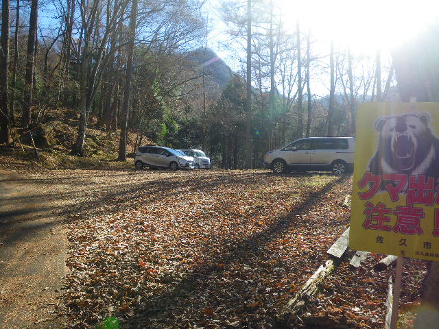 荒船不動下の登山者用P。ここに御岳手前のコルに上がる登山道の道標は無い