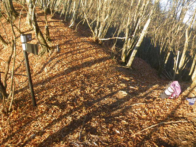 御岳手前のコルにも、荒船不動(写真右)へ下る道標は無い