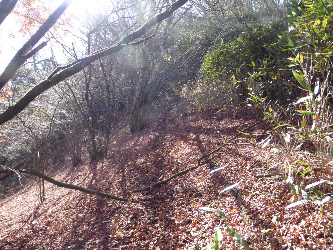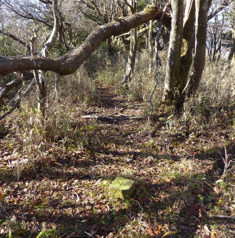 笹の中に付けられた踏み跡(はっきりしていて、かなり太かった)を辿った。 笹は被るように進行を邪魔するが、身を低くすると割と楽に進めた。
