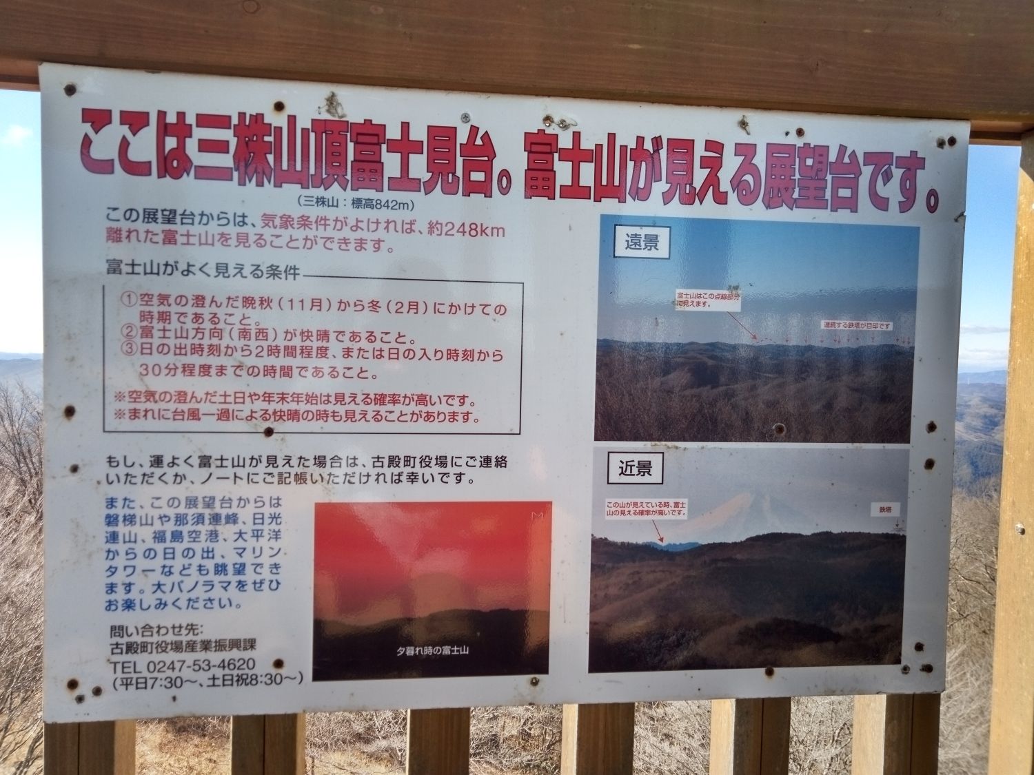 立派な展望台からの阿武隈の山々は素晴らしい! 八溝山、蓬田山、大滝根山や太平洋、遠くは日光方面や那須連山が見える。富士山の見える山としても案内板が設置されていた。