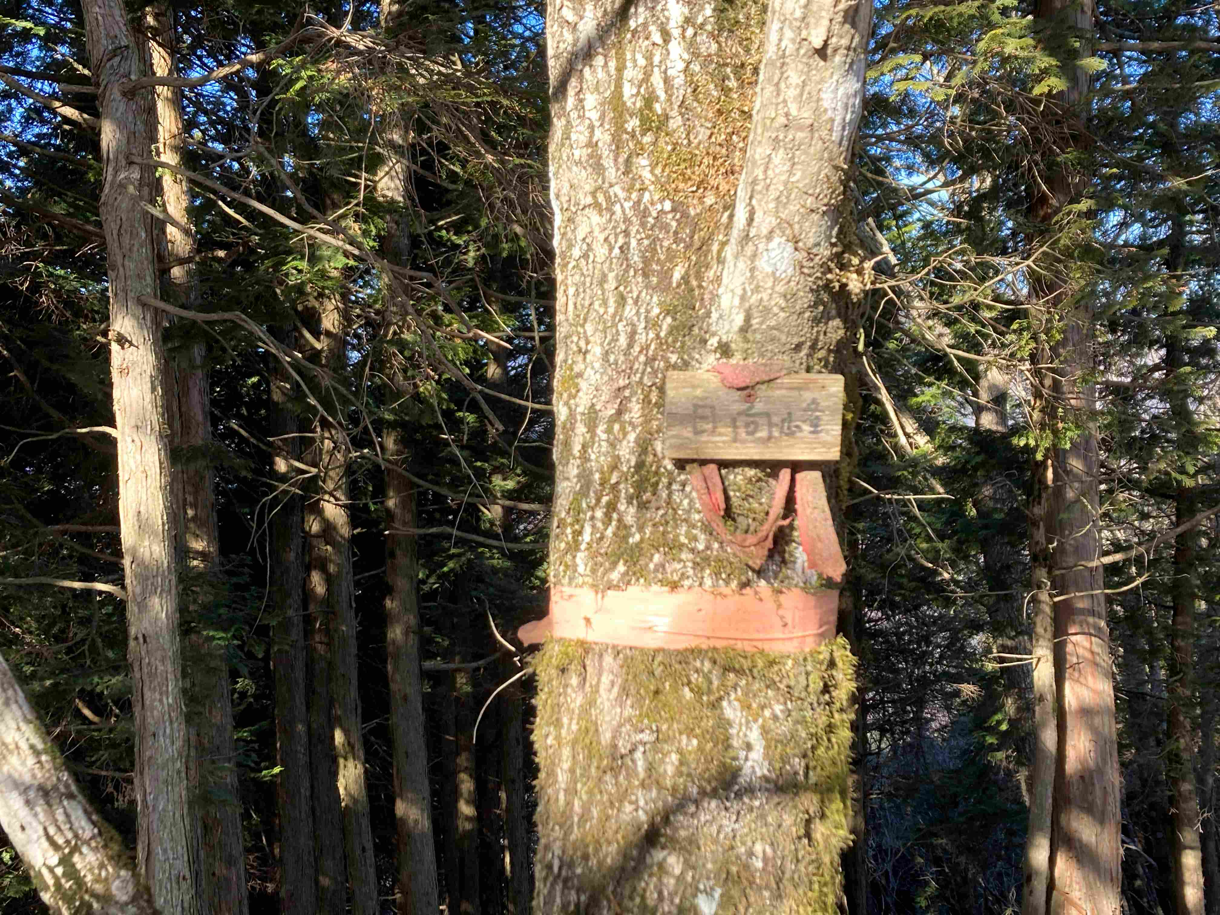 【日向峰】SOTA山(JA/YN-049)ですが、見つけにくく、赤いテープを目印に脇道に入り、藪をかき分けてやっと見つかる。標識も小さい。