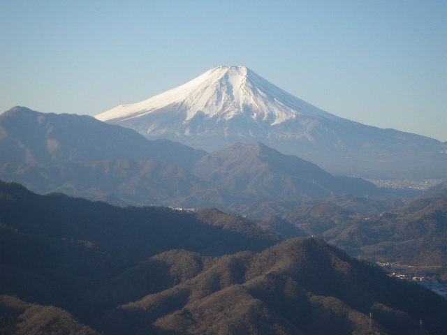 途中の展望地から望む富士山。左は、御正体山