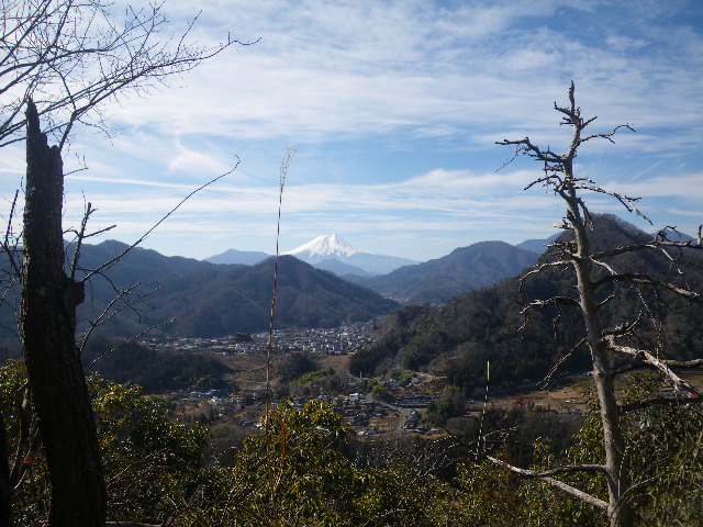 大月の町並みと富士山。手前右は岩殿山 (35.3738 138.5745)