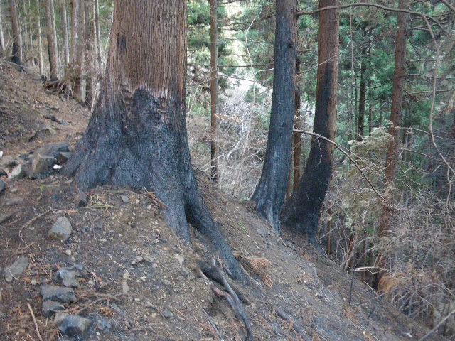 梨ノ木平 → 大久保山 → 扇山 (往復) 梨ノ木平近くから、もう焼け跡があり、稜線まで続く。 山火事で落ち葉は燃え、枯れ木は真っ黒に炭化していたが、杉や桧の植林は 下部の表皮が1〜2m位片側だけ焼けただけで、生育には問題ないと思われる。 上部の疎林も同様。 全山が丸裸の山火事でなくて、少しホッとした。
