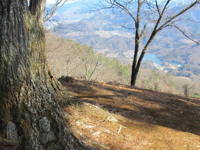 扇山山頂から上野原側へ下り始めると、燃え広がった火元側だけあって焼け焦げている木も目立ちます。それは犬目丸の山頂まで広がっていましたが、その先の荻ノ丸方面は無事でした。犬目丸展望台からの眺めはよく、談合坂SAをまたいで大野貯水池から四方津駅まで下る長いルートがよく見えました。
